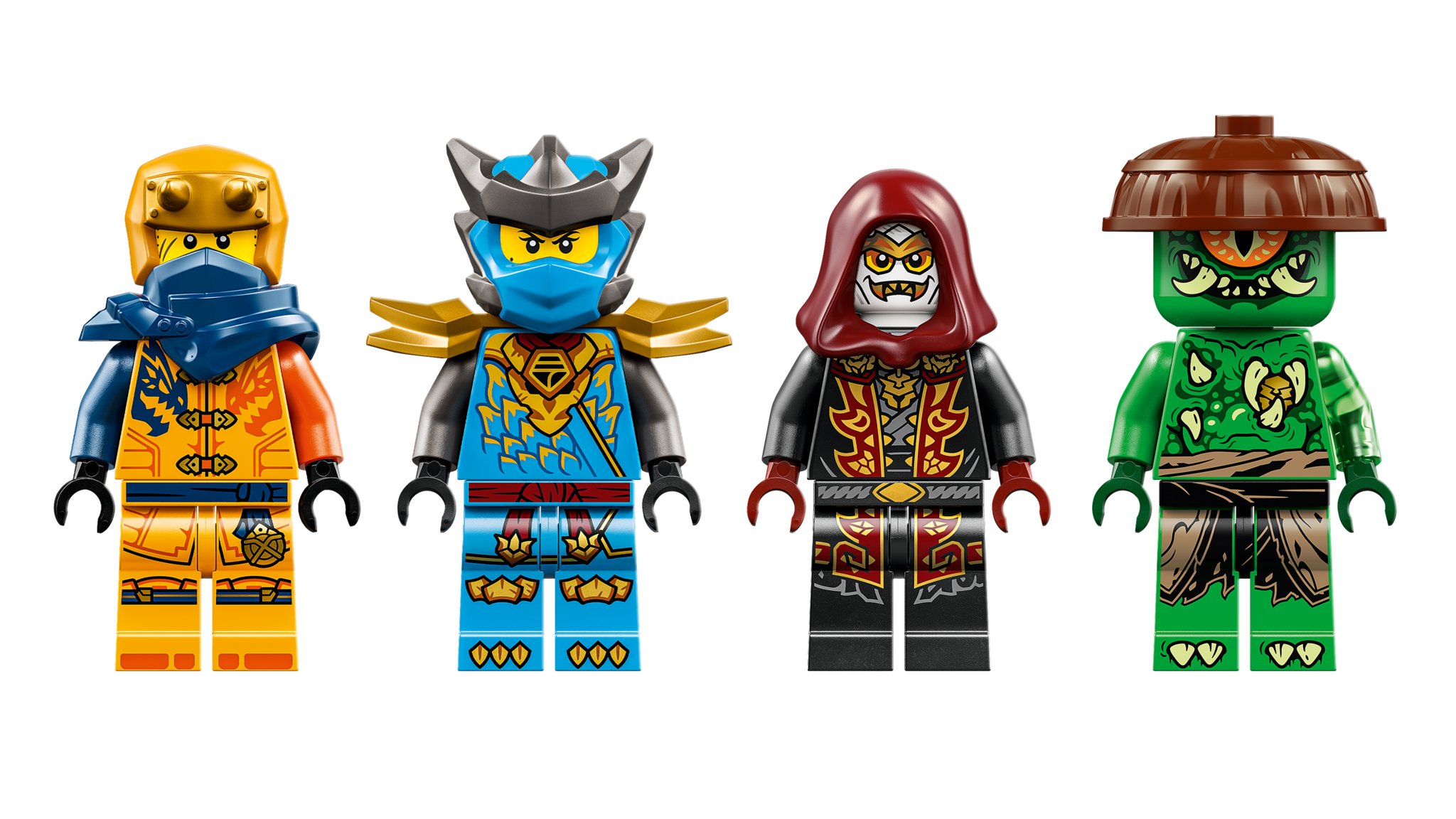 - 4 MINIFIGURE NINJAGO®: ricrea le battaglie tra eroi e cattivi con i ninja Arin e Nya Forma Drago che affrontano i cattivi Mostro della Mutazione e Lealista, tutti dotati di armi accessorie